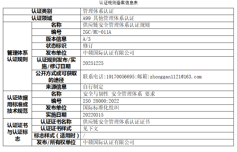 本次公示的认证规则版权归属于中赣国际认证有限公司(以下简称“本机构”),本机构享有最终解释权。未经本机构书面许可,任何组织或个人不得以任何形式全部或部分使用、复制或传播本公告涉及的认证规则信息(法律法规另有规定的除外)。