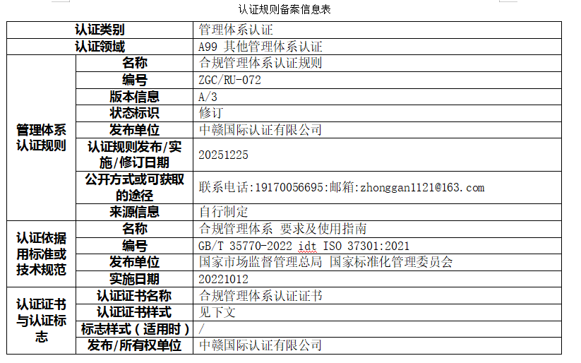 本次公示的认证规则版权归属于中赣国际认证有限公司(以下简称“本机构”),本机构享有最终解释权。未经本机构书面许可,任何组织或个人不得以任何形式全部或部分使用、复制或传播本公告涉及的认证规则信息(法律法规另有规定的除外)。