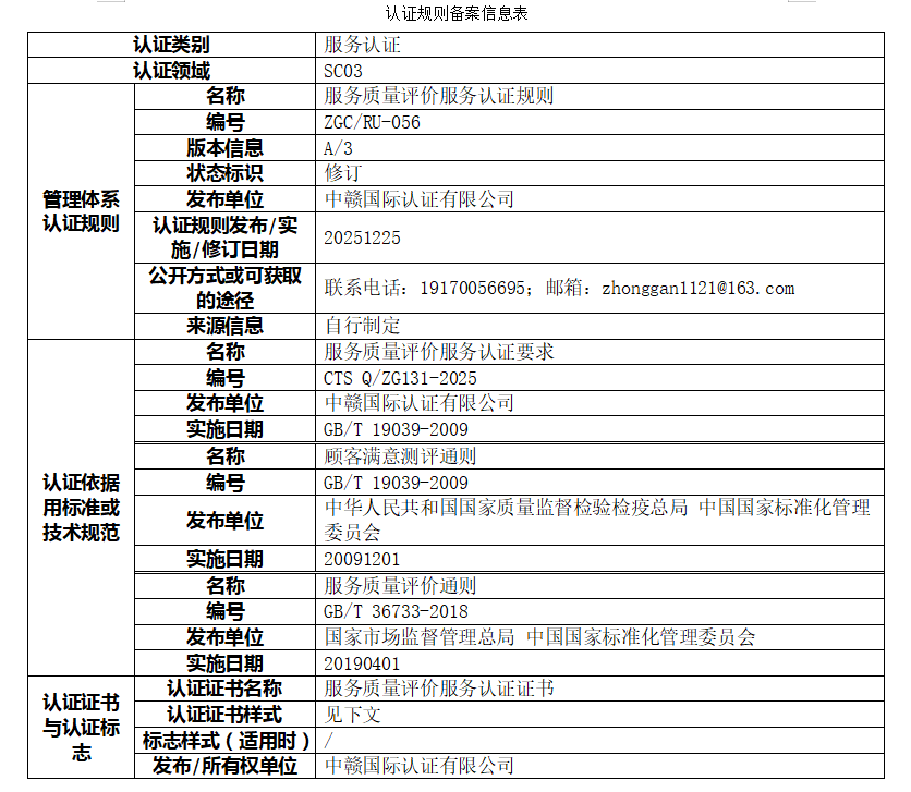 本次公示的认证规则版权归属于中赣国际认证有限公司(以下简称“本机构”),本机构享有最终解释权。未经本机构书面许可,任何组织或个人不得以任何形式全部或部分使用、复制或传播本公告涉及的认证规则信息(法律法规另有规定的除外)。